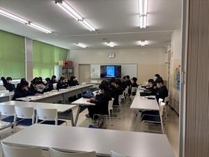 4校の高校の先生に来ていただき、学校説明をしてもらいました。生徒たちの体調を考え、急遽リモートでの開催に変更しました。各学校の特色や進路先の状況など、動画等を使いながら丁寧に説明していただきました。3年生は、高校進学へのイメージがだんだんと出来上がってきたのではないでしょうか。
