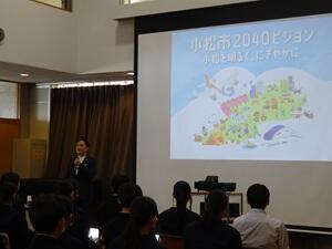 最初に、宮橋市長から「小松市2040ビジョン」の紹介がありました。空港都市、産業都市、未来創造都市、健康と文化の都市など、小松市が持っている様々な可能性を引き出し、2040につなげていくという話が印象的でした。ビジョンを聴いていると、ワクワクした気持ちになりました。身近な所でいうと、粟津駅周辺整備により東西両方から改札ができるという話がありました。実現したら便利になりますね。