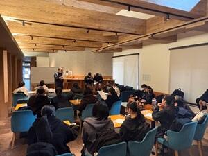 客室や厨房を見学した後、喜多総支配人から温泉旅館の経営や今後の展開などについて説明していただきました。コロナ禍を乗り越え今があることや、常に新しいことを学び続け考え続け挑戦し続けることの大切さなどについて教えていただきました。
