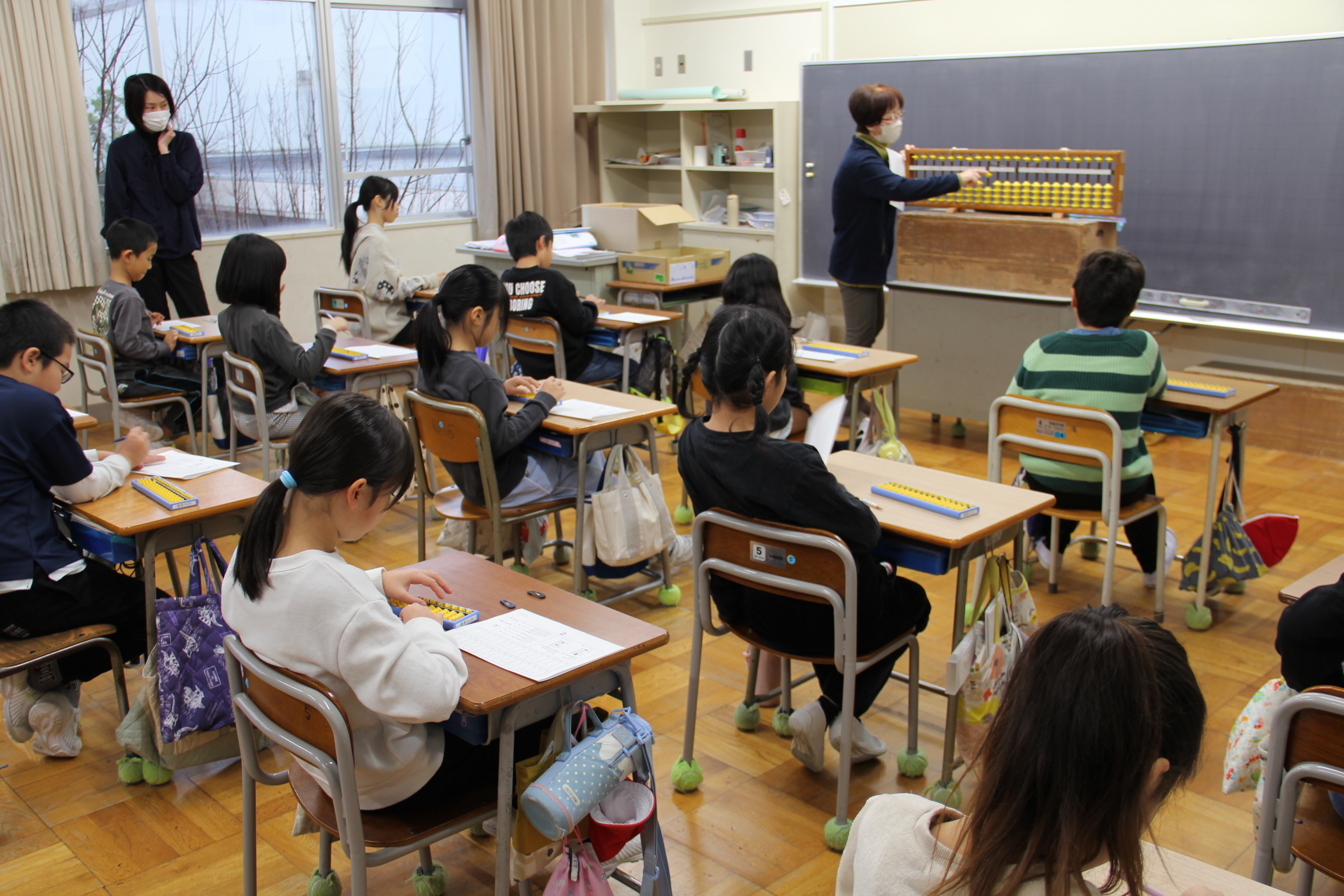 12月2、3日の2日間、3年生がそろばんの先生 南口さんをお迎えし、そろばんの使い方を習いました。各クラス2時間の学習でしたが、最後には簡単なたし算・ひき算の計算をそろばんを使ってやってみました。やり方がわかり、自分でそろばんを使って計算できた時には、とてもうれしそうでした。
