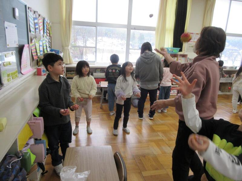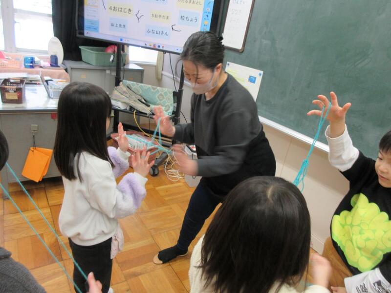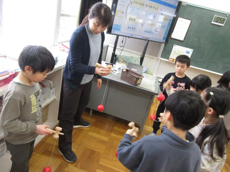 2月6日(金)1年生は地域のおばあちゃんを学校にお招きして、「昔遊びの会」を開きました。けんだま おはじき お手玉 だるまおとし あやとりなど室内で遊べる道具で大人と一緒に楽しい時間を過ごしました。