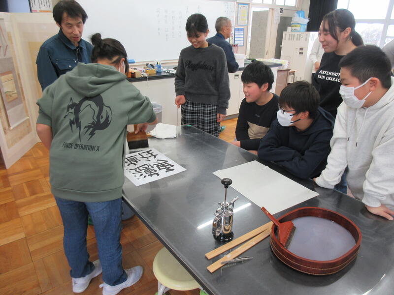 2月16日(月)石川県職業能力開発協会様のお世話でものづくりマイスター「表具裏打ち士」の方が本校に来て6年生の卒業制作の習字の裏打ちを教えてくださいました。