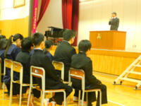 朝礼後にみんなで大掃除をして、体育館で令和8年度の前期生徒会執行部の任命式と2学期終業式を行いました。