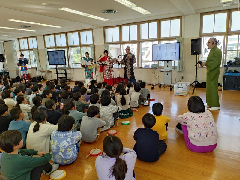 鑑賞教室では、沖縄に伝わる歌やエイサーの踊りを紹介していただきました。みんながよく知っている曲の演奏もあり、一緒に歌ったり、手作りの楽器を鳴らしたり、曲に合わせて踊ったりと楽しい時間を過ごしました。