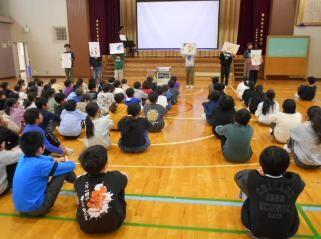 昼休みに図書委員会が紙芝居をしてくれました。1~3年生は、最後まで楽しんで参加していました。読み手の図書委員会の子たちは、よく練習してあり、間の取り方や聞き手に問いかけながらの読み方が上手で感心しました。